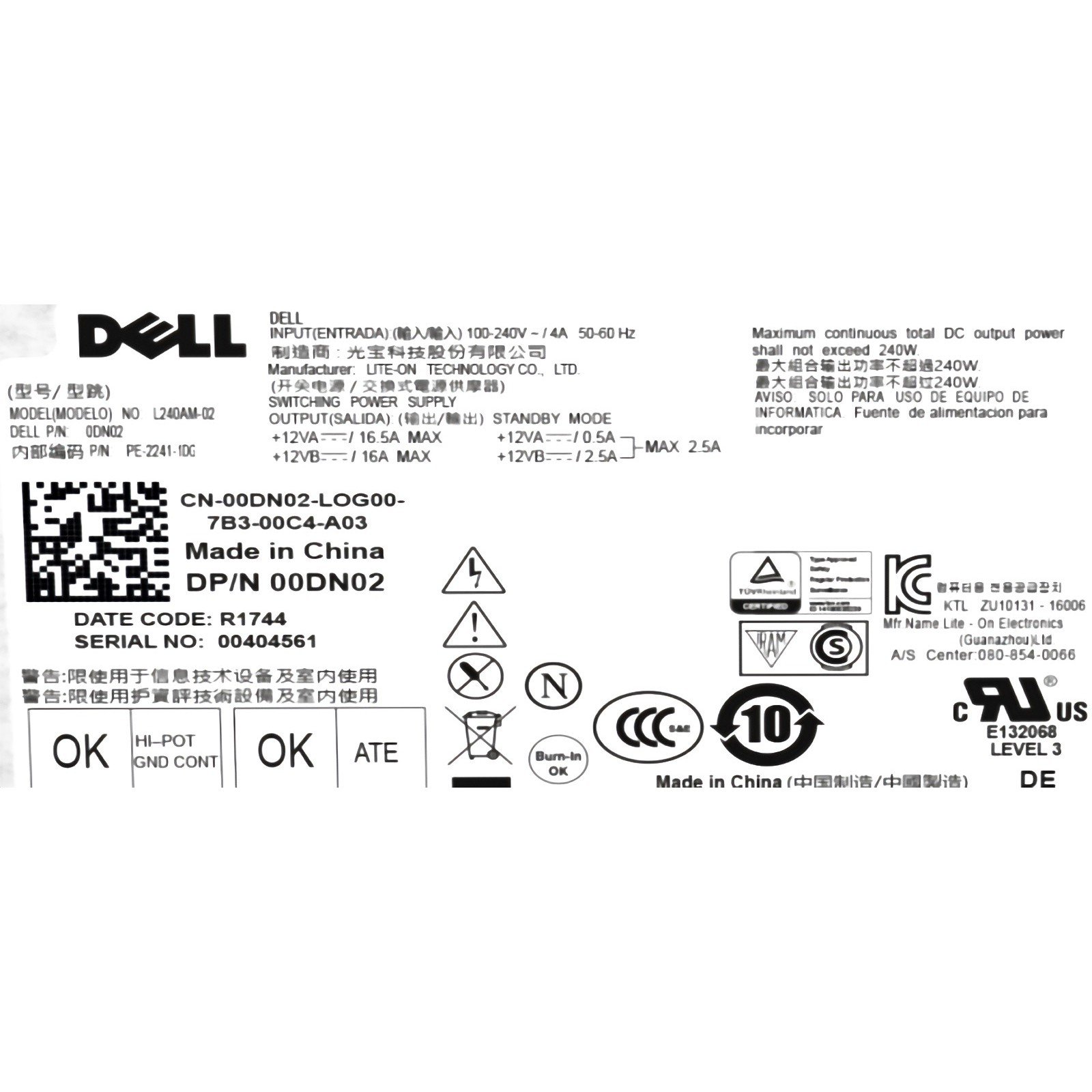 Dell L240AM-02 PE-2241-1DG CN-00DN02 0DN02 7B3-00C4-A03 240 w
