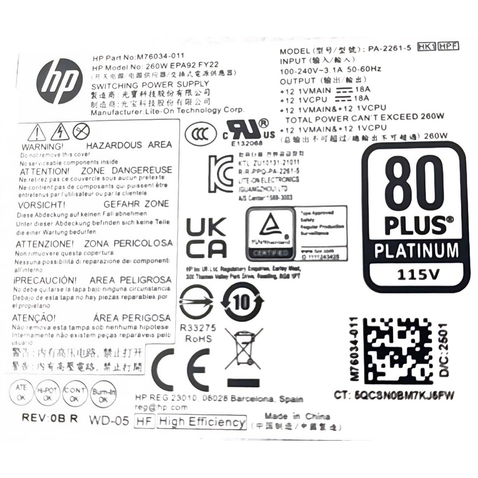 HP PA-2261-5 M76034-011 260W EPA92 FY22 260w