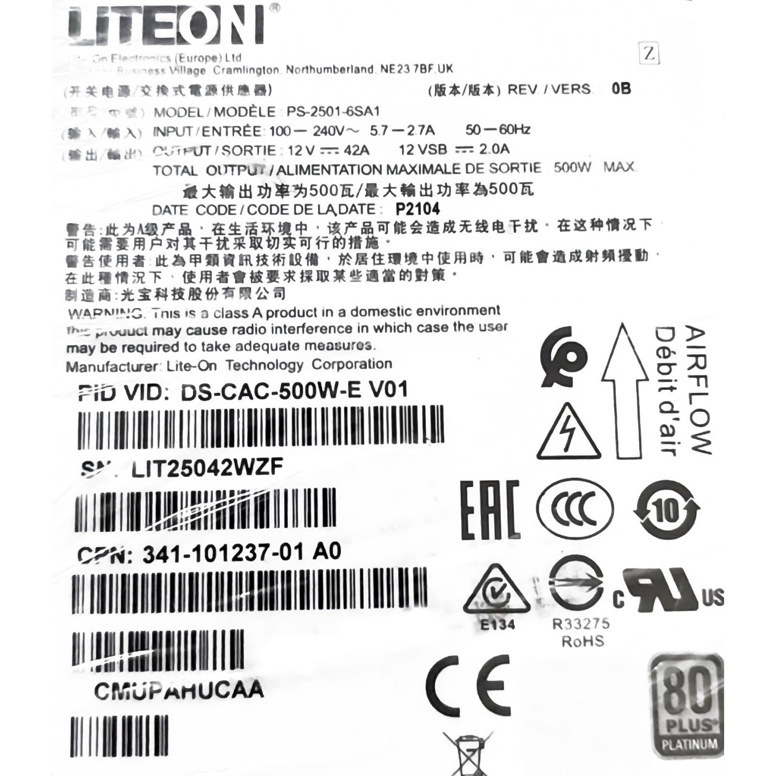 Lite-On PS-2501-6SA1 DS-CAC-500W-E 341-101237-01 A0 500w